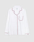In white with burgundy trim, a pocket on the upper left side of the shirt, and pants with an elastic waistband and bow. The pocket features a hand-embroidered Petite Siesta® moon.