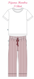 Camiseta en color blanco con detalles en burgundy, pantalón estampado rayas con cintura elástica y lazo. El bolsillo lleva una luna Petite Siesta® bordada a mano.