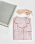 Este pack reúne tres imprescindibles para una noche perfecta: pijama camisero de rayas Burgundy en algodón 100% pima orgánico, manta 100% baby alpaca gris melange y antifaz de seda personalizado.